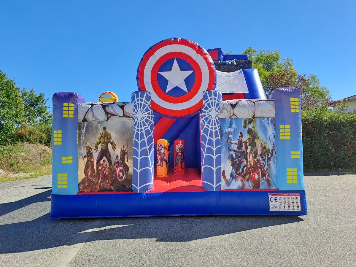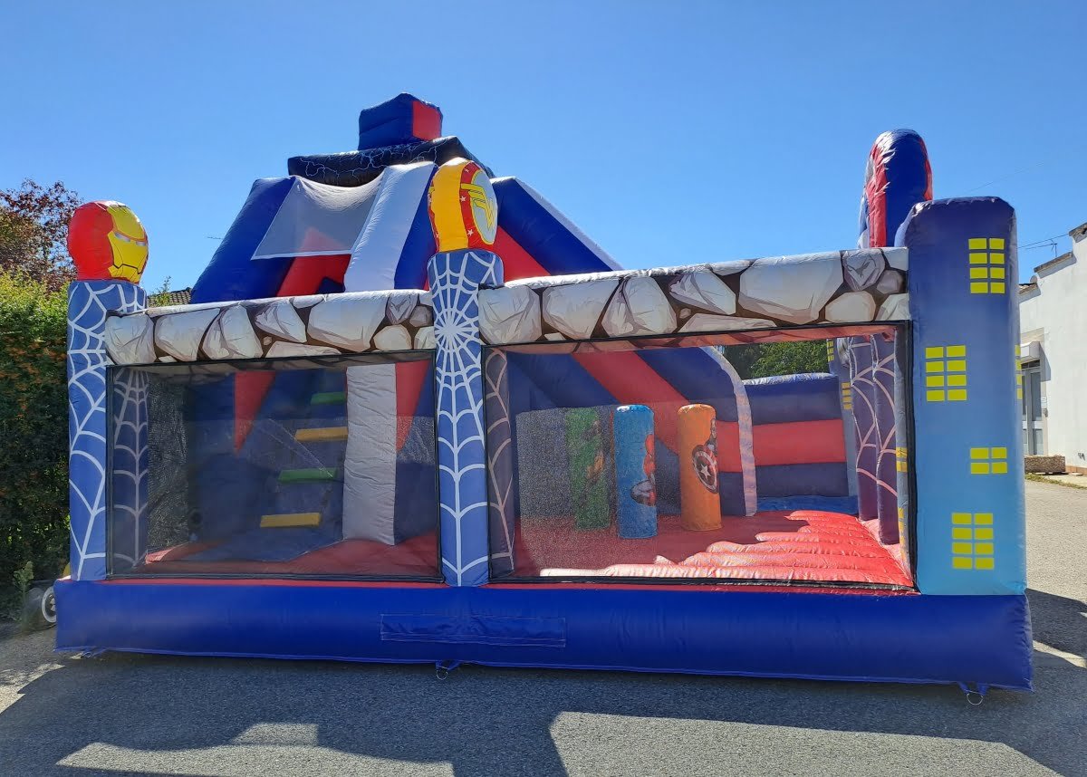 Faites vivre des aventures palpitantes aux enfants avec ce château gonflable Super Héros à louer chez Elite Animation.